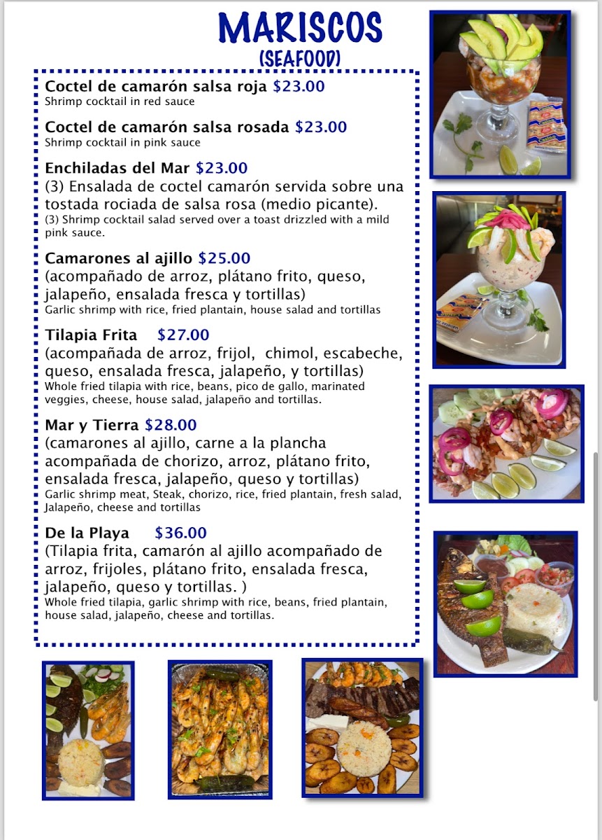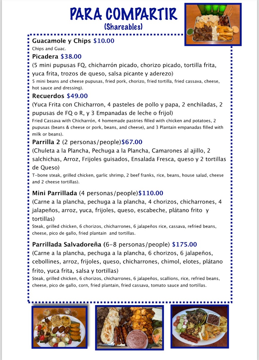 (Chuleta a la Plancha, Pechuga a la Plancha, Camarones al ajillo, 2 salchichas, Arroz, Frijoles guisados, Ensalada Fresca, queso y 2 tortillas de Queso) T-bone steak, grilled chicken, garlic shrimp, 2 beef franks, rice, beans, house salad, cheese and 2 cheese tortillas).
